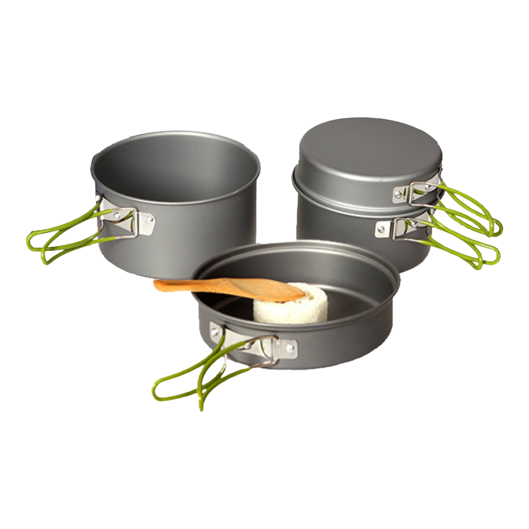 Cook set made up of a medium and large billy, medium multi-purpose lid and large multi-purpose lid. The set is made from hardened anodised aluminium, making it lightweight and durable. The set also comes with a bamboo spoon, pot scrubber for easy cleaning, and a mesh carry bag for storage. Total weight:650g.